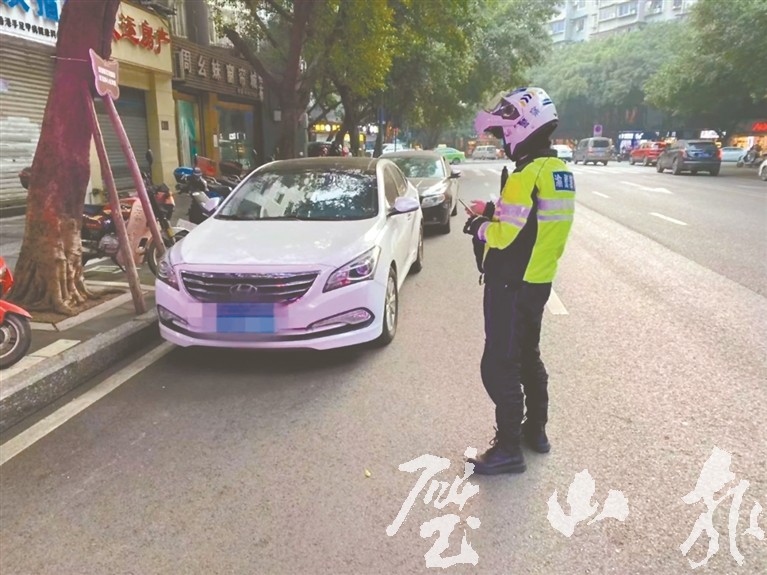 本报讯(记者 廖健韬 文/图)随着城市正常生产生活的恢复,道路通行压力也逐步回升。连日来,区交巡警支队集约警力,在城区范围内持续开展车辆乱停乱放劝导整治专项行动,全力优化辖区道路通行环境。