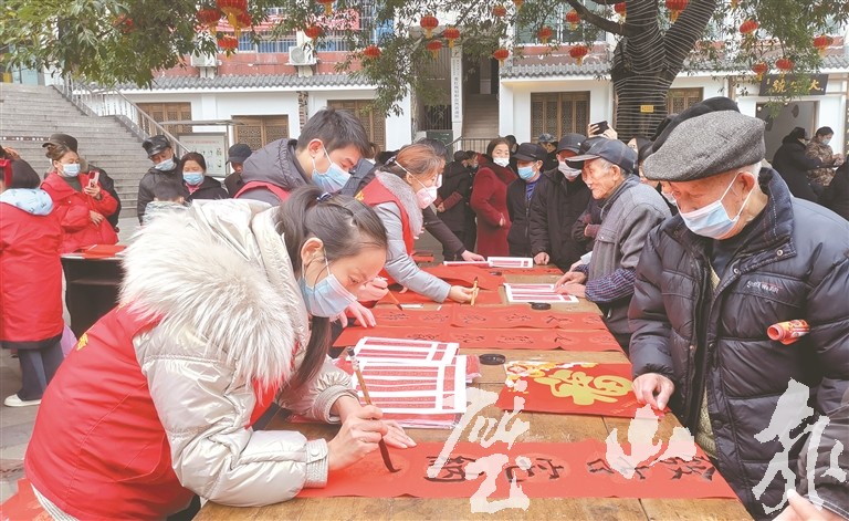 “虎啸群山辞旧岁 兔奔匝地庆新春”“春光辉映满堂春 福气降临阖家福”……一只只毛笔饱蘸浓墨,在大红色的纸上舞动,横撇竖捺之间,浓浓的年味跃然纸上。活动现场,书法爱好者们挥毫泼墨,为当地群众现场书写春联200余幅。