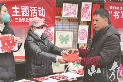 在写春联的同时,剪纸活动也在热闹进行中。三合镇剪纸艺术团的老师为村民们传授剪纸艺术,大家很快就投入其中。一张张红纸,经过一双双巧手和一把把剪刀的巧妙加工,变成了形态各异的剪纸艺术品。
