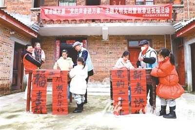 在院坝一角,区文联的书法爱好者正挥毫泼墨,不一会儿,一幅幅行云流水的书法作品跃然纸上,红红的春联也被整齐挂在院坝的一角,吸引了不少村民前来挑选。随后,志愿者还将写好的春联送到该村老人和留守儿童手中。