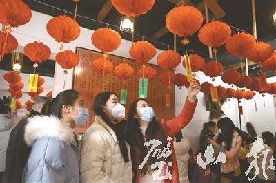 台上唱罢,台下又忙活起来。在茶室的另一边,高挂的大红灯笼显得格外喜庆,百余条灯谜被悬挂在里面。前来猜灯谜的居民三五成群,他们时而相互交流讨论,时而冥思苦想,沉浸在欢乐的氛围中。
