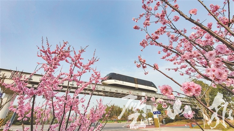 2月28日,一辆云巴从绽放的花海驶过。连日来的暖阳赶走了料峭春寒,璧山各大公园、街道、乡村随处可见竞相争艳的鲜花,花红如火、蕊黄如焰,为城市增添不少靓丽色彩。(记者 曾清龙 摄)