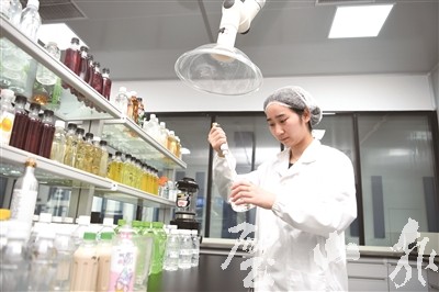 | 反复试验、不断优化,精益求精、攻坚克难,科研人员的工作充满挑战,而科研领域的巾帼们用细心、耐心、恒心,在科研道路上突破一个又一个难题,用青春“浇灌”科研之花,培育出一个又一个科研硕果。图为3月4日,品正食品科研人员汪娟精心配比饮料配方。 |