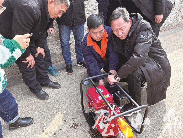 培训中,农机技术人员讲解和演示了抽水机的操作要点和具体步骤,并组织参与培训的综治专干和种植大户们亲自上机操作,确保各村(社区)至少有一人会使用抽水机。
