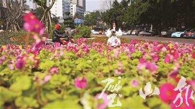 4月10日,位于璧青路上的鲜花姹紫嫣红、竞相开放,映衬着绿叶特别养眼,吸引了不少市民拍照打卡。(记者 杨文广 摄)